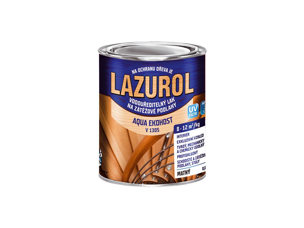 LAZUROL AQUA EKOHOST je vysoce procentní polyuretanový vodouředitelný podlahový lak s vysokou odolností, tvrdostí a efektním vzhledem, zvýrazňuje kresbu dřeva. Používá se pro nátěry dřeva v interiérech (nábytek, parkety, korkové krytiny) a pro nátěry savých materiálů (dřevovláknité desky, překližky). Obsahuje UV filtr. Vyrábí se jako bezbarvý lak v polomatném a matném provedení. Splňuje podmínky protikluznosti.