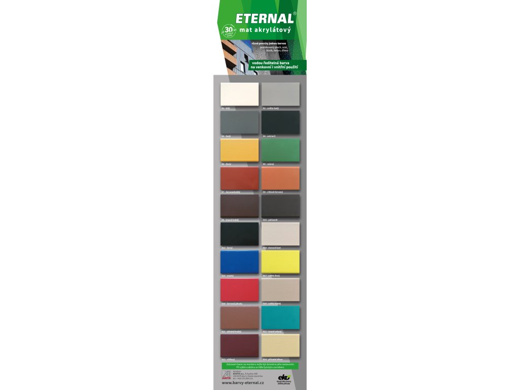 ETERNAL mat akrylátový je hedvábně matná akrylátová vodou ředitelná barva pro venkovní i vnitřní použití. Je určena k novým i udržovacím nátěrům pozinkovaného plechu (i bez předchozí oxidace), oceli opatřené antikorozním základním nátěrem, hliníku (přilnavost nutno předem ověřit). Lze jej použít i k nátěrům nepochozího betonu, mědi, nepochozího dřeva, neglazované keramiky a dalších stavebních materiálů. Svou kvalitou je vhodný i pro zpracování při průmyslových aplikacích. Nátěry jsou vysoce elastické, mají dlouhodobou životnost a jsou prověřené při nátěrech střešních krytin.