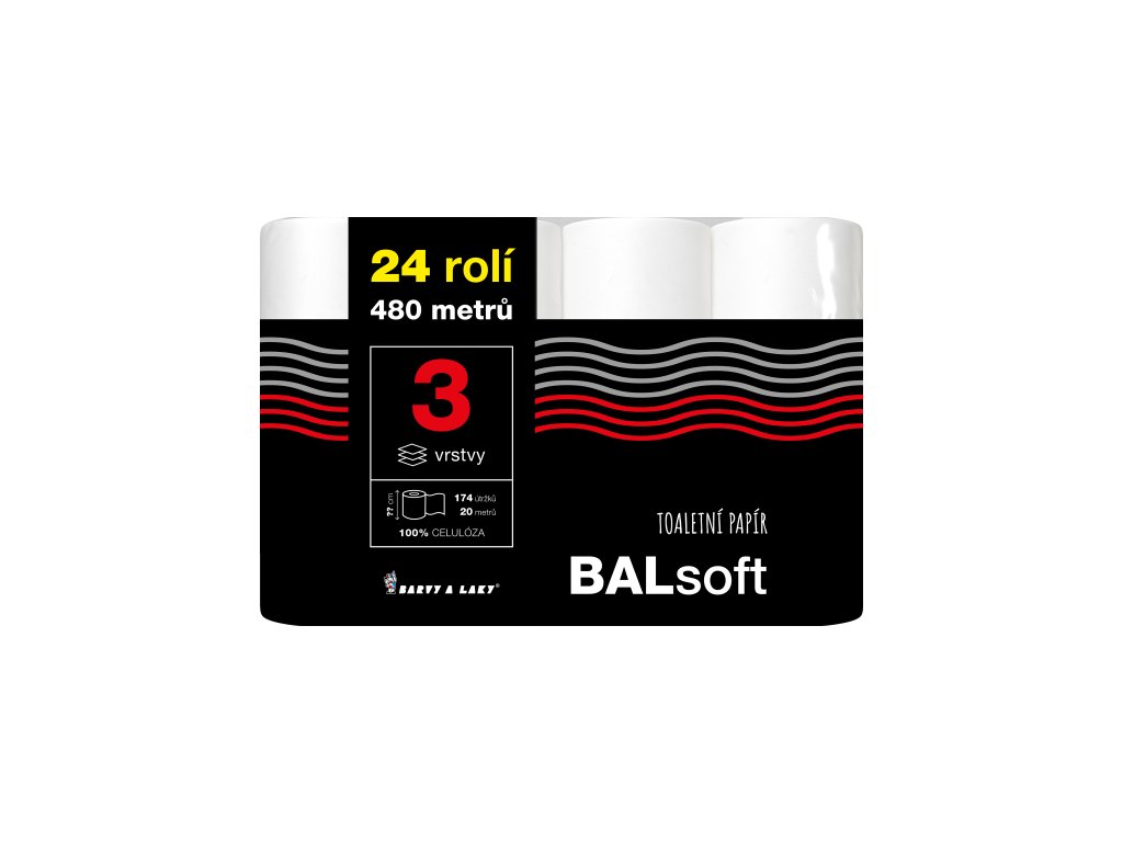 Jemný bílý třívrstvý toaletní papír BALsoft vyroben ze 100% celulózy vhodný pro každodenní používání. U tohoto toaletního papíru je Vám v jedné roli k dispozici 174 útržků v celkové délce 20 metrů.