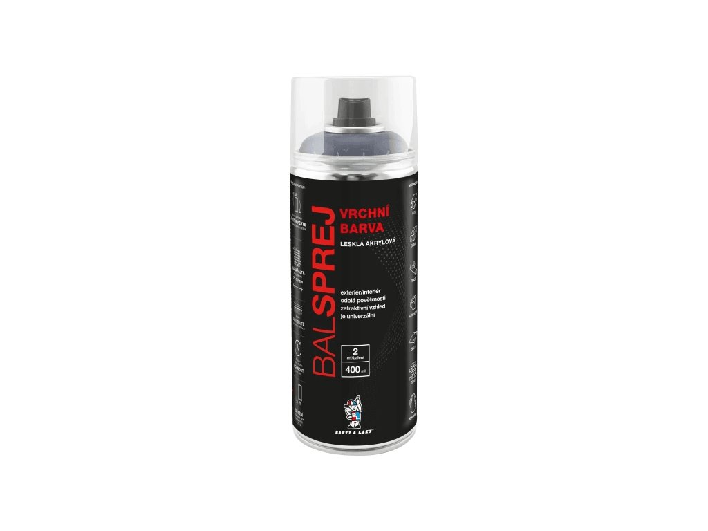 BALSPREJ je univerzální lesklá vrchní barva ve spreji použitelná k nátěrům dřeva, kovu, karoserií, některých umělých hmot. Vyniká vydatností, je rychleschnoucí, po nástřiku nestéká. Je odolná proti povětrnostním vlivům a korozi. Je přestříkatelná Bezbarvým akrylovým lakem ve spreji.
