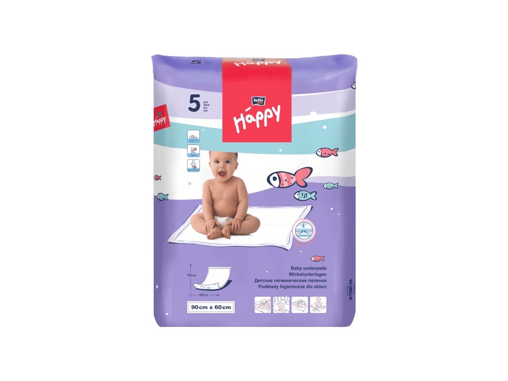 Dětské přebalovací podložky Bella Happy jsou vyrobeny z měkké a na dotek příjemné vlákniny. Jsou určeny k přebalování dětí, kde zajišťují ochranu při výměně plenek. Mají rozměr 90 x 60 cm a balení obsahuje 5 ks. Spodní strana je vyrobena z nepropustného materiálu. Z hlediska hygienického jsou ideální pro přebalování na cestách. Podložku můžete použít opakovaně. Podložky na přebalování Happy jsou vyrobeny z měkké, na dotek příjemné vlákniny.