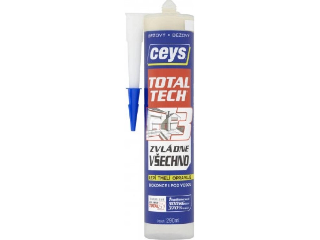 Ceys Total Tech lepí, tmelí a opravuje jakýkoliv materiál v interiéru i exteriéru, dokonce i pod vodou. Dodává okamžitou počáteční přilnavost a odolává velmi tvrdým podmínkám. Vysoká vyplňovací schopnost. Ultra elastický 370 %. Odolnost v tahu 300 kg/10cm². Bez rozpouštědel. Nepoškozuje citlivé materiály. Maximální přilnavost s okamžitým účinkem. 100% vodotěsný a nepropustný. Nestárne a odolává UV záření. Lze jej natírat za vlhka.
