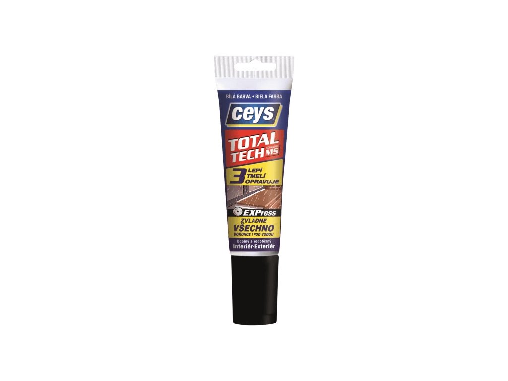 Ceys Total Tech express lepí, tmelí a opravuje všechny materiály v interiéru i exteriéru dokonce i pod vodou. Odolává těm nejtvrdším podmínkám, jako je voda, led, vlhkost a plíseň, rány, vibrace, tlaky, teplota, nestárne v průběhu času a odolává UV záření.