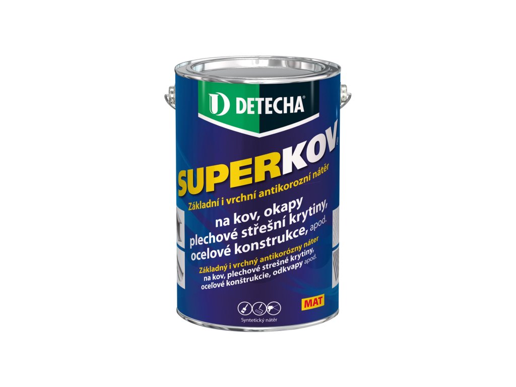 Základní i vrchní antikorozní syntetická barva na kov určená k povrchové úpravě kovových materiálů a k jejich účinné ochraně proti vzniku koroze. Vytváří vysoký bariérový efekt proti trvalému působení povětrnostních vlivů a slunečního záření. K dlouhodobé ochraně (až 8 let) postačí 2 - 3 vrstvy Superkovu bez předchozího základního nátěru. SUPERKOV je základní i vrchní antikorozní nátěr na kov, plechové střešní krytiny, ocelové konstrukce, okapy apod.
