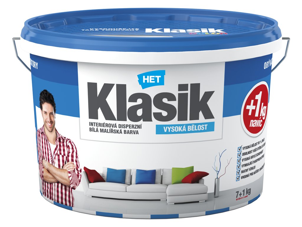 Disperzní malířská barva na zeď s opticky vylepšenou bělostí 94 %, kryvostí a vysokou paropropustností. Barva na malování omítek, betonu, sádrokartonu,...
