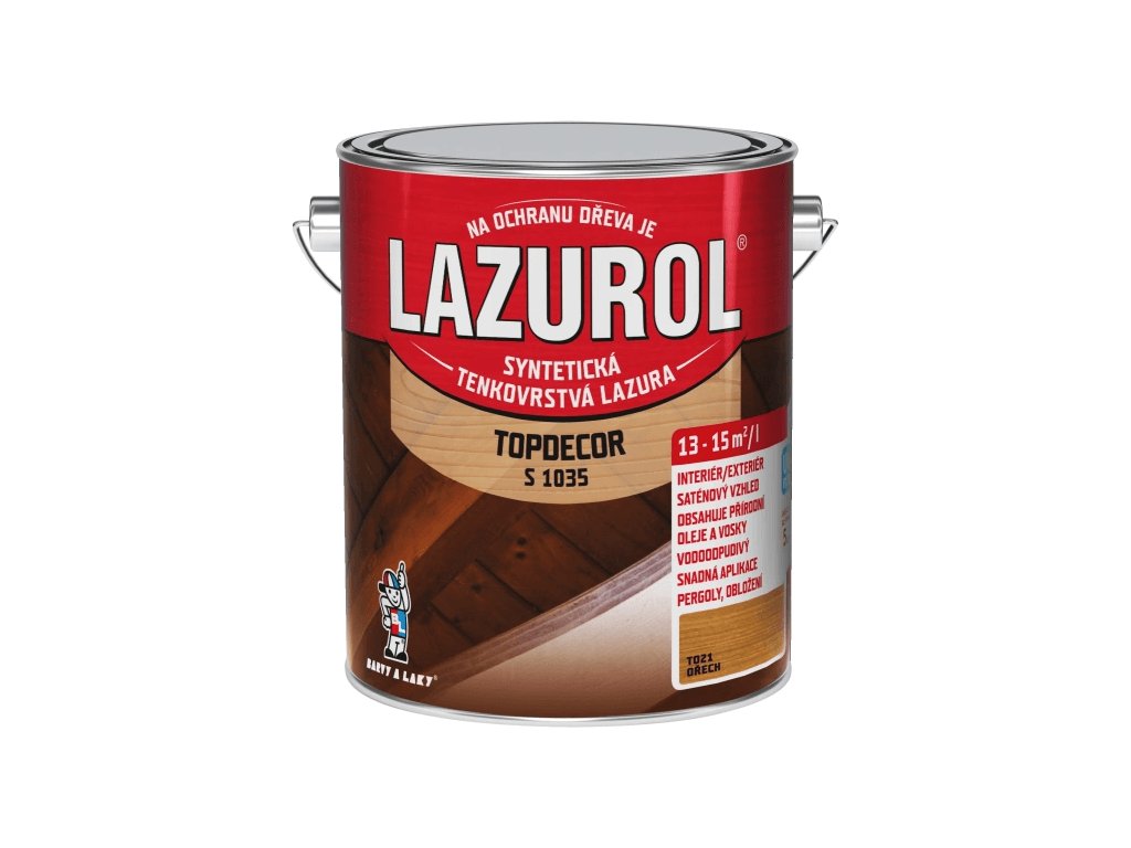 Lazurol Topdecor S1035 tenkovrstvá lazura na dřevo je určena k ochranným lazurovacím nátěrům měkkého i tvrdého dřeva, vystaveného povětrnostním vlivům, i k nátěrům v interiérech (zahradní nábytek, dřevěné štíty, podhledy, obložení stěn a stropů, ploty, chaty a dřevěné domky, okna, dveře, korek, penetrace dřevěných podlah ). Lazura na dřevo obsahuje vosk, přírodní olej a transparentní oxidy železa. Hluboce proniká do struktury dřeva a zdůrazňuje jeho strukturu. Poskytuje dlouhodobou ochranu dřeva proti vodě a UV záření. Nátěry jsou stálobarevné, snadno obnovitelné a nepraskají. Odstín 0000 - bezbarvý je určen pouze pro použití v interiéru!!