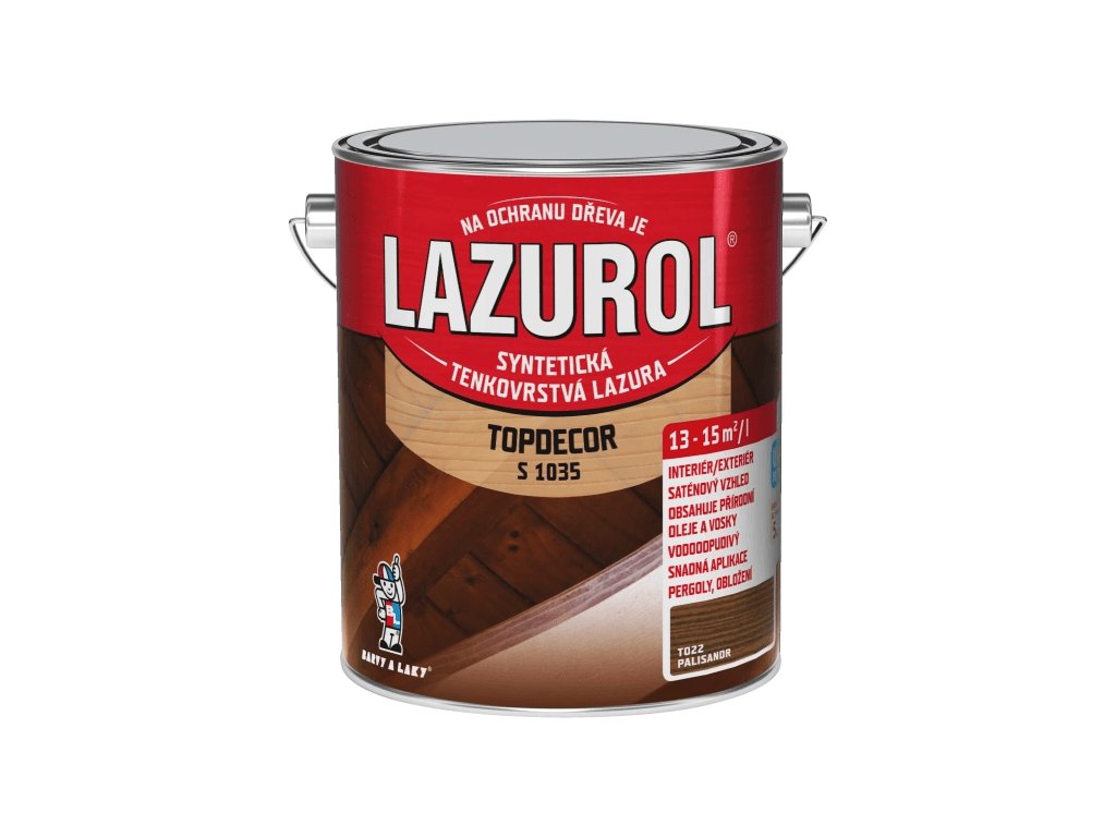 Lazurol Topdecor S1035 tenkovrstvá lazura na dřevo je určena k ochranným lazurovacím nátěrům měkkého i tvrdého dřeva, vystaveného povětrnostním vlivům, i k nátěrům v interiérech (zahradní nábytek, dřevěné štíty, podhledy, obložení stěn a stropů, ploty, chaty a dřevěné domky, okna, dveře, korek, penetrace dřevěných podlah ). Lazura na dřevo obsahuje vosk, přírodní olej a transparentní oxidy železa. Hluboce proniká do struktury dřeva a zdůrazňuje jeho strukturu. Poskytuje dlouhodobou ochranu dřeva proti vodě a UV záření. Nátěry jsou stálobarevné, snadno obnovitelné a nepraskají. Odstín T000 -přírodní je určen pouze pro použití v interiéru!!