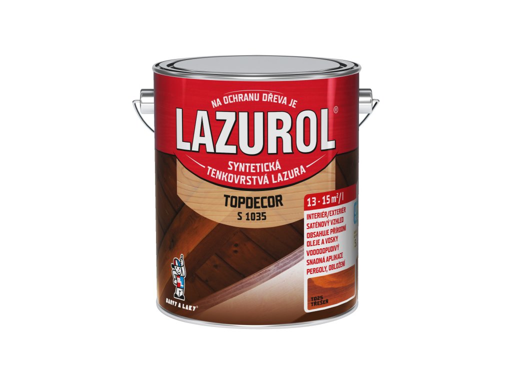 Lazurol Topdecor S1035 tenkovrstvá lazura na dřevo je určena k ochranným lazurovacím nátěrům měkkého i tvrdého dřeva, vystaveného povětrnostním vlivům, i k nátěrům v interiérech (zahradní nábytek, dřevěné štíty, podhledy, obložení stěn a stropů, ploty, chaty a dřevěné domky, okna, dveře, korek, penetrace dřevěných podlah ). Lazura na dřevo obsahuje vosk, přírodní olej a transparentní oxidy železa. Hluboce proniká do struktury dřeva a zdůrazňuje jeho strukturu. Poskytuje dlouhodobou ochranu dřeva proti vodě a UV záření. Nátěry jsou stálobarevné, snadno obnovitelné a nepraskají. Odstín 0000 - bezbarvý je určen pouze pro použití v interiéru!!