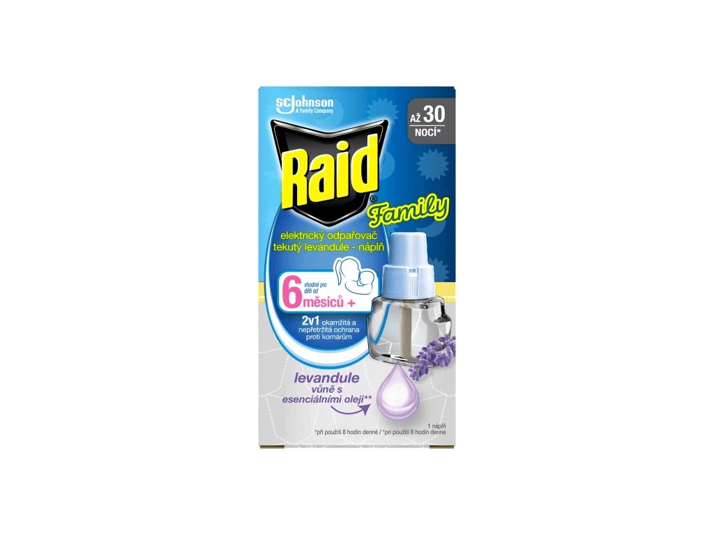 Raid proti komárům je náplň pro elektrický odpařovač s tekutou náplní levandule, insekticid poskytuje efektivní ochranu proti komárům až 45 nocí/8 hodin/noc. Poskytuje nepřetržitou a diskrétní ochranu bez nepříjemného zápachu nebo dýmu.