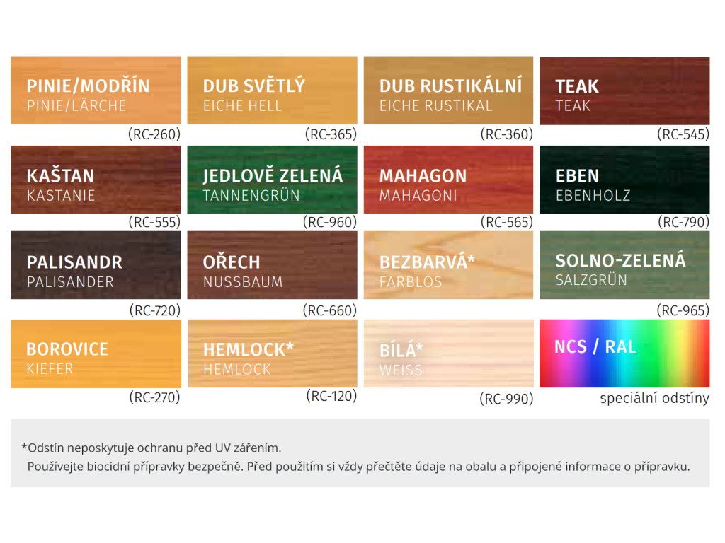 V odstínech farblos (bezbarvý), bílý a hemlock používejte pouze na venkovní plochy, které jsou vystaveny povětrnostním vlivům jen nepřímo, jako střešní podhledy atd., nebo jako základní nátěr.