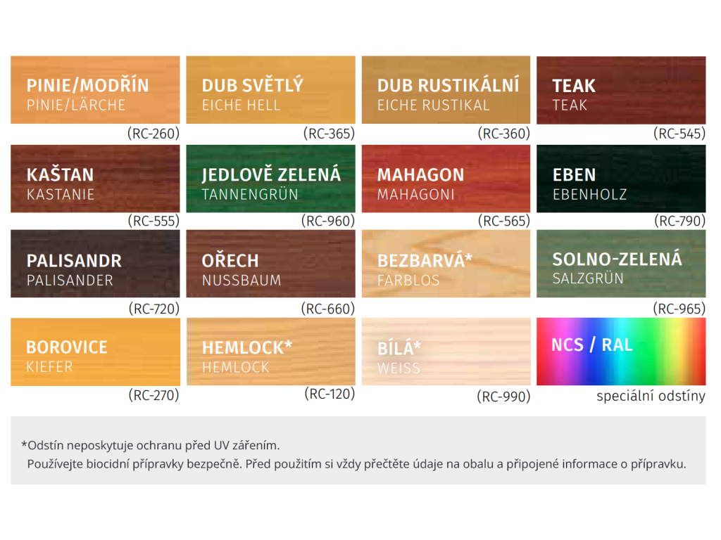 V odstínech farblos (bezbarvý), bílý a hemlock používejte pouze na venkovní plochy, které jsou vystaveny povětrnostním vlivům jen nepřímo, jako střešní podhledy atd., nebo jako základní nátěr.