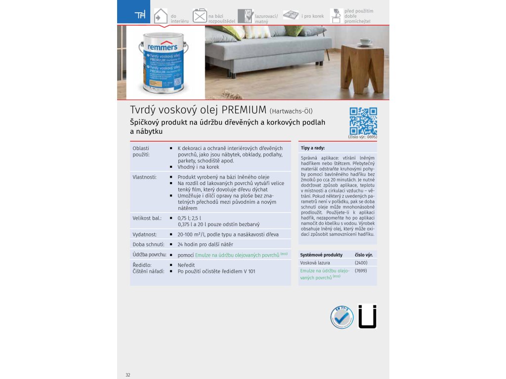 Při broušení dřevěných povrchů, ošetřených pomocí tohoto výrobku, noste vždy ochranu dýchacích cest (filtrovou masku P2).