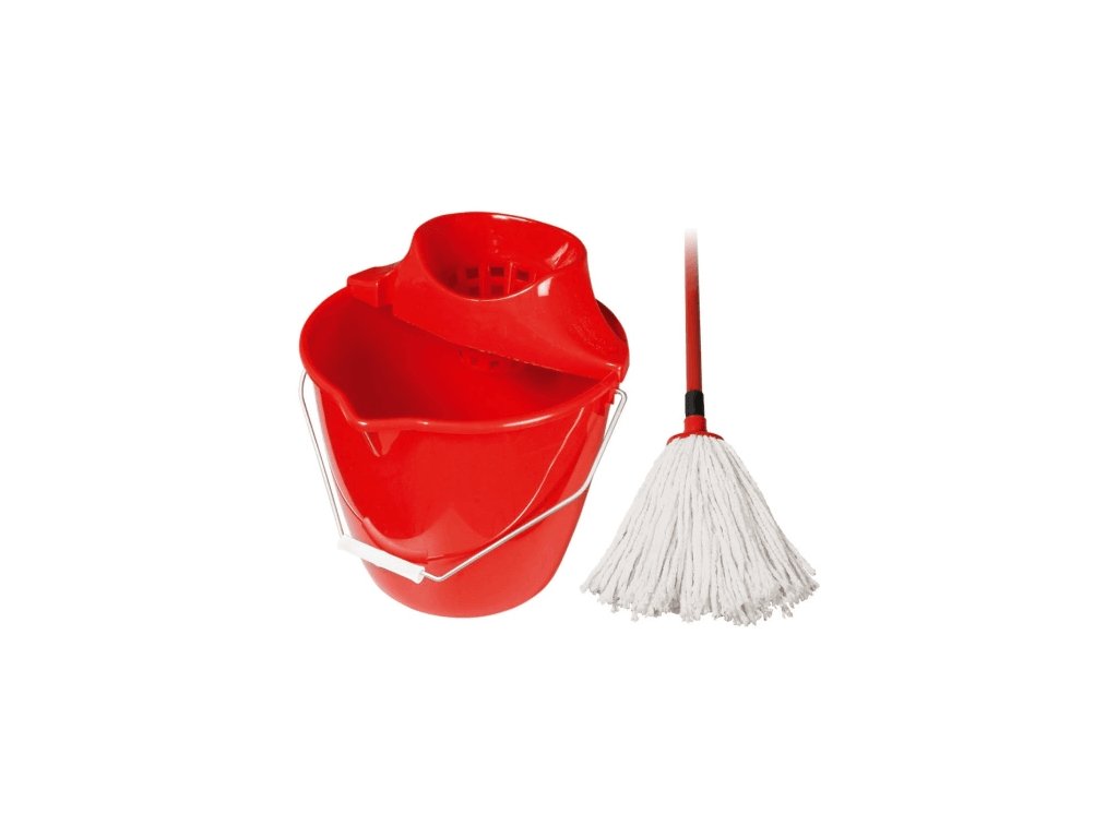 Úklidová souprava SPOKAR obsahuje kbelík kulatý 10 litrů, ždímač, kovovou hůl, mop bavlněný 160 g.
