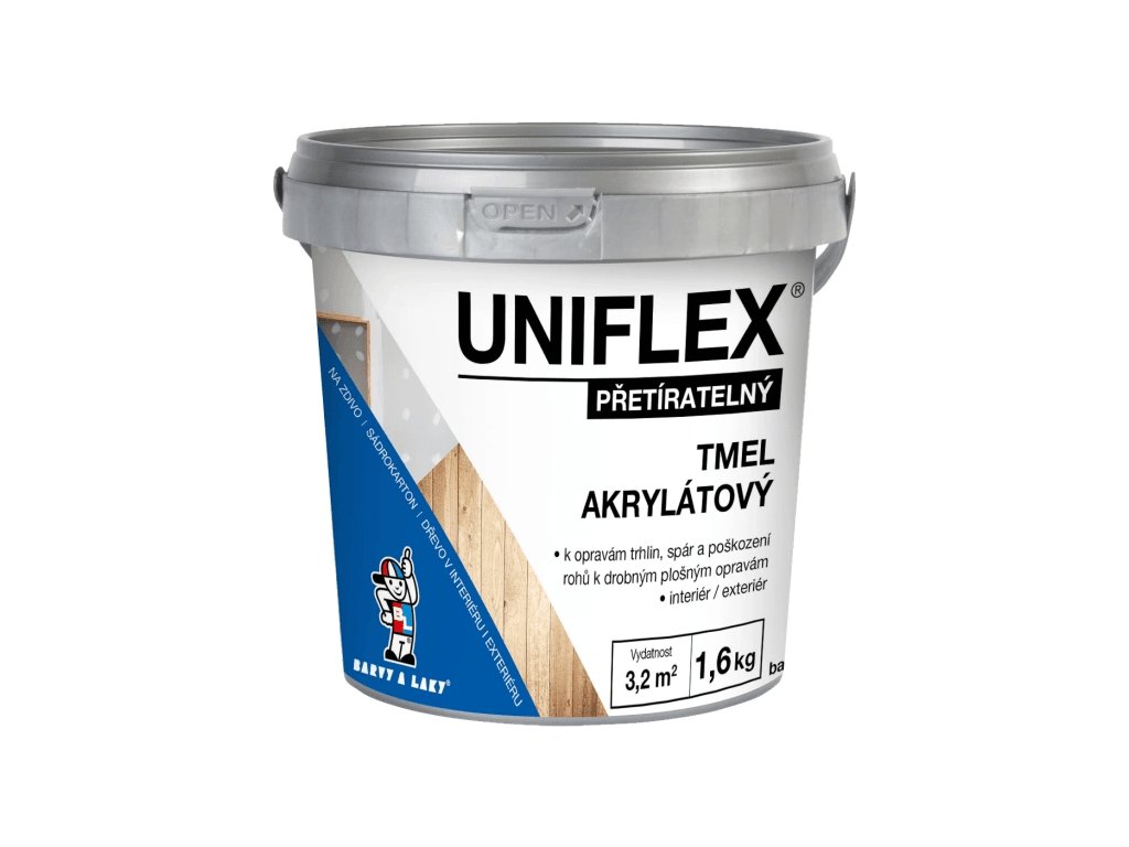 Akrylátový pastovitý tmel k drobným opravám zdiva, sádrokartónu a dřeva v interiéru i exteriéru. Uniflex tmel či lepidlo určené na tmelení středních a větších nerovností, vynikající přilnavost na většině povrchů, především na kov, ocel, kámen, beton, dřevo atd., přetíratelný, pro vnitřní i venkovní použití.